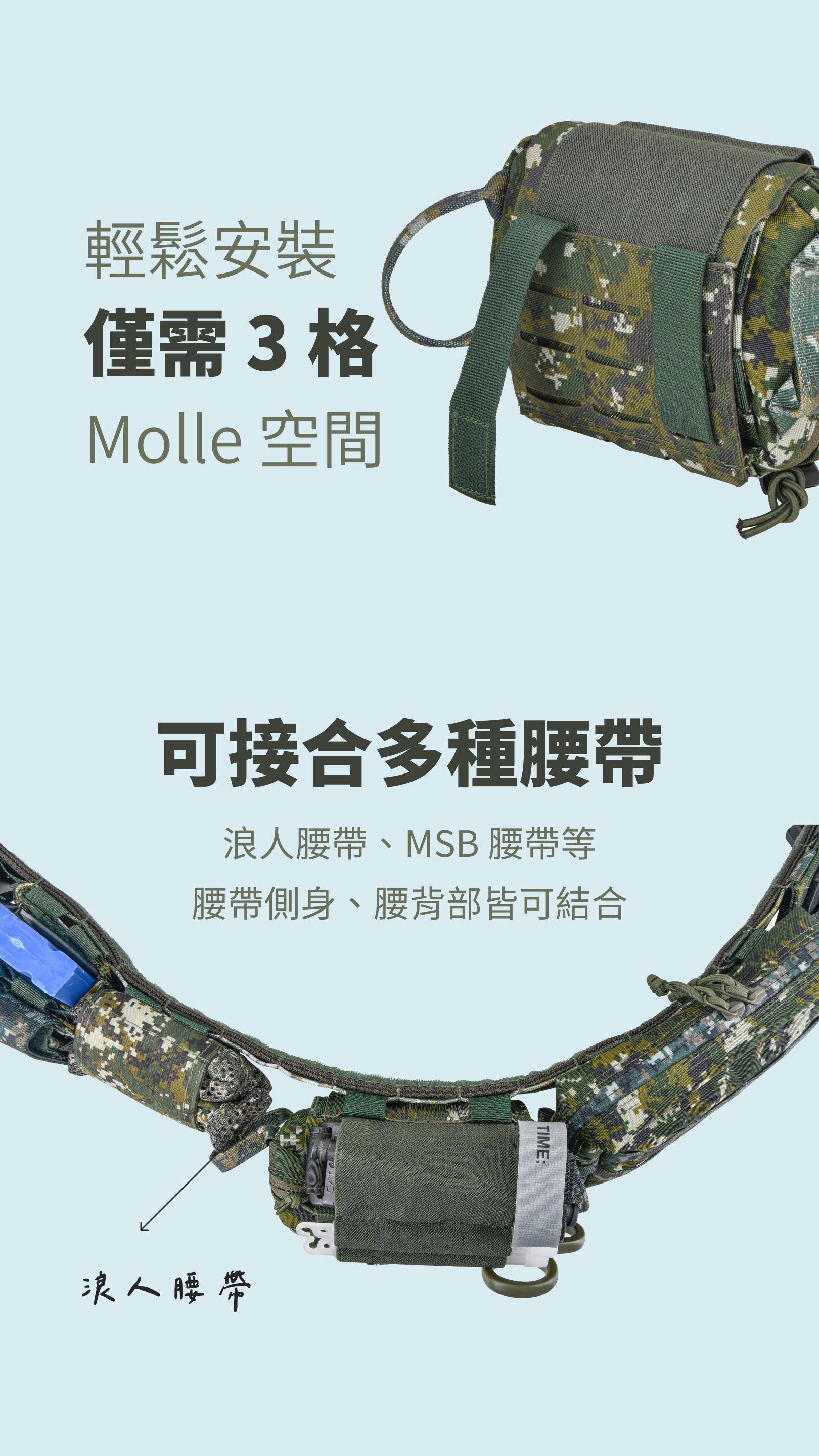 而這款 分離式 IFAK 兼容腰帶、MOLLE 系統,無論是 浪人腰帶、MSB、戰術背心側掛 都能輕鬆安裝,且只需三格 MOLLE 空間,確保裝備模組不打架。