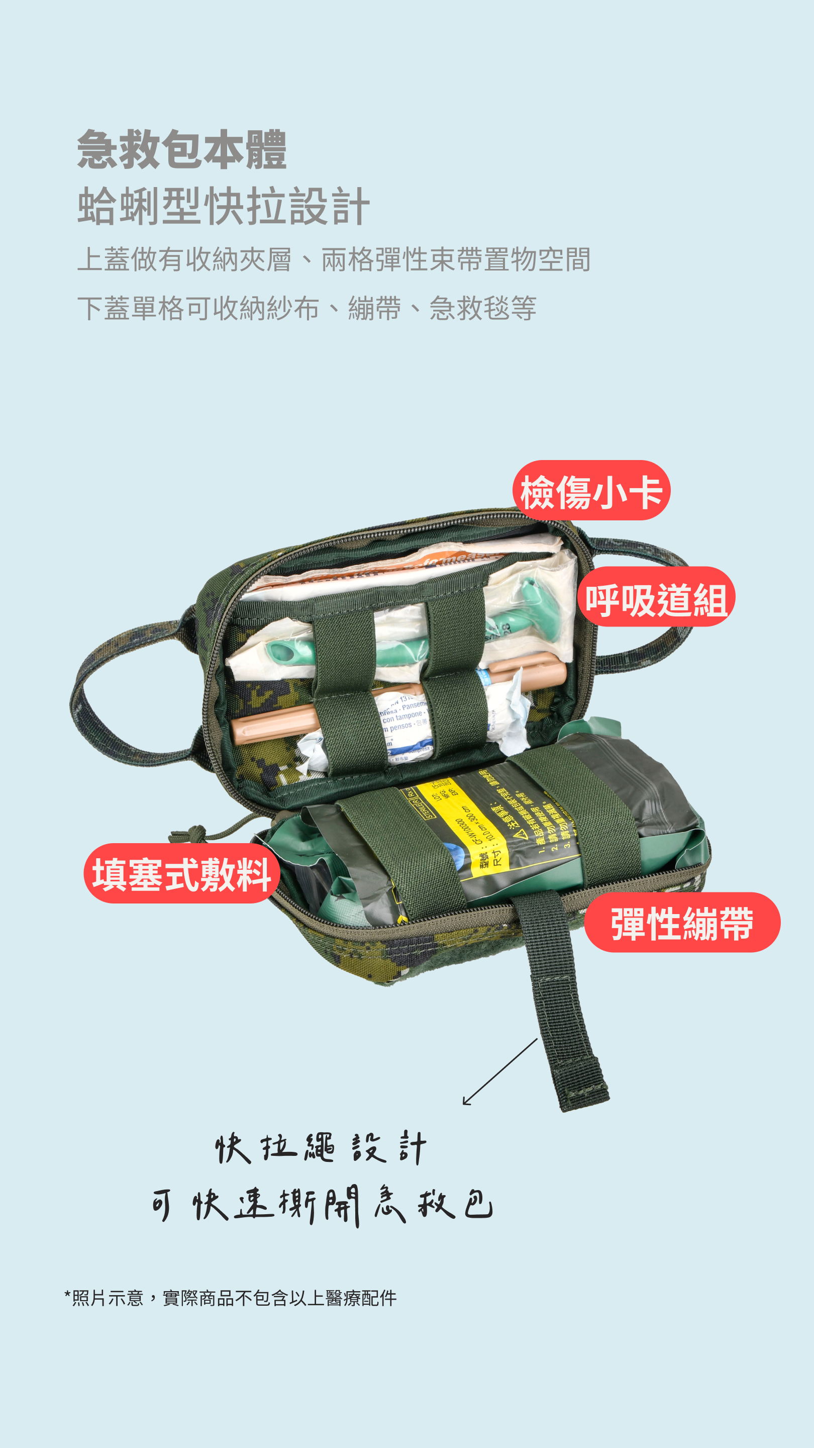 採用軍規耐磨材質,提供極致收納與模組化擴充,確保所有急救配件有條不紊地擺放,面對緊急狀況不再手忙腳亂!