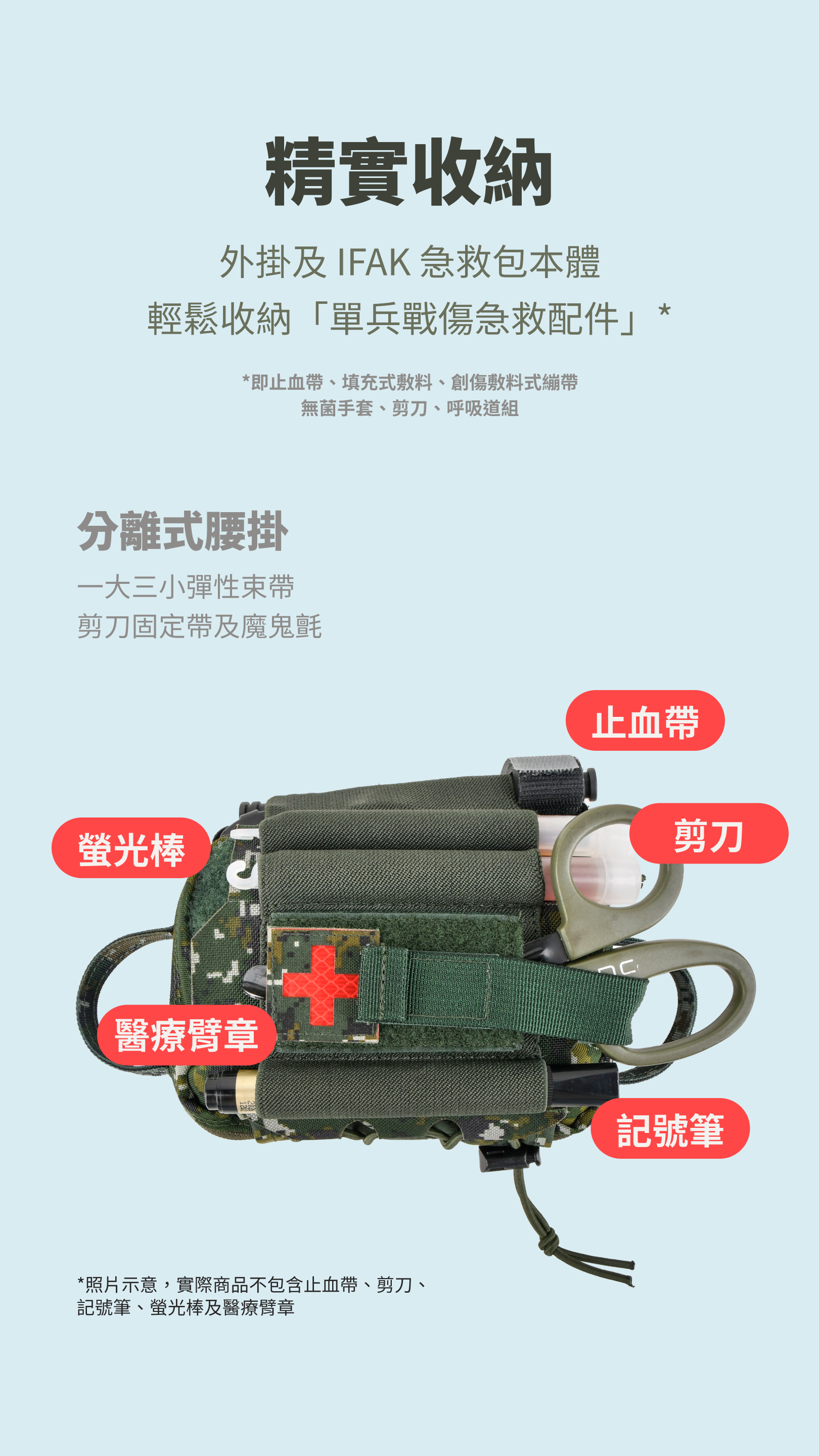 不論是 突擊、伏擊、救援行動,都不會影響你的靈活度,讓急救裝備真正融入你的戰術配置。