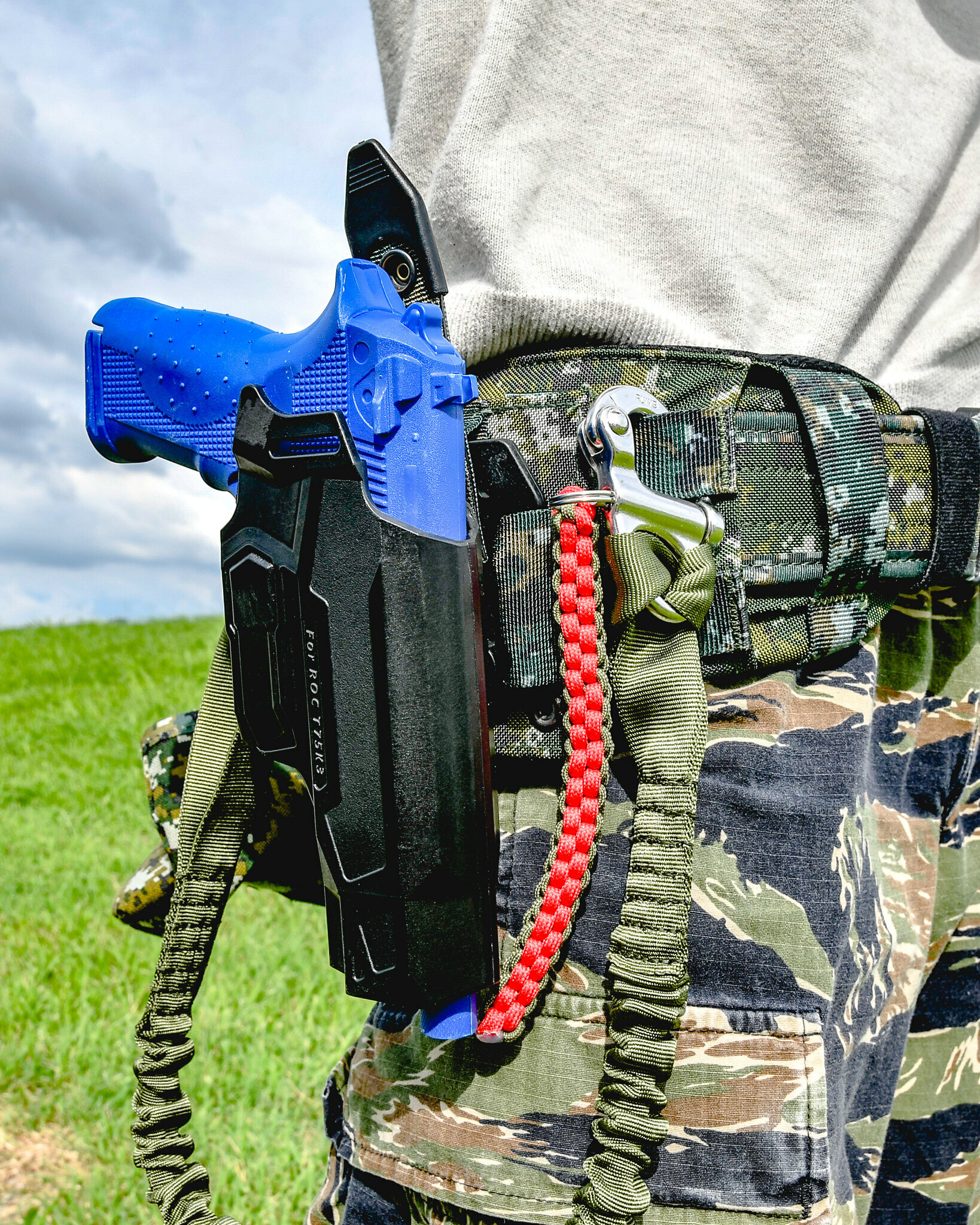 專為 T75K3 設計的貼合型腿掛系統:外殼採用尼龍樹脂混合玻璃纖維成型,維持剛性與形狀記憶,使手槍在激烈動作下仍穩定就位、抽取順暢。