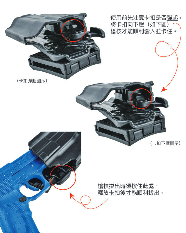 第一次使用先將內部卡隼往下壓,槍枝便會緊密貼合槍套。